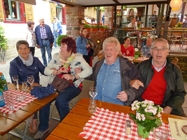 (Rheintal) „Es war ein tolles Erlebnis, wir hatten eine Bombenstimmung“, berichtet das Tischclübchen Uschi, Ernst, Eta, Evi, Michael, Anni, Ute und Ottmar, das sich auf der Tagesfahrt des Seniorenverbands zusammengefunden hatte. Der Höhepunkt war noch lange Gesprächsthema: „Ein Weinchen in der Quetsch!“ Gemeint ist die kernige Erlebniswirtschaft der besonderen Art, die „Quetschkommod“ in der berühmten Rüdesheimer Drosselgasse.
