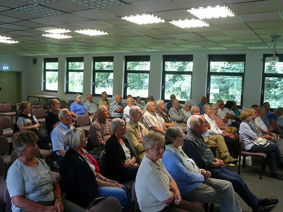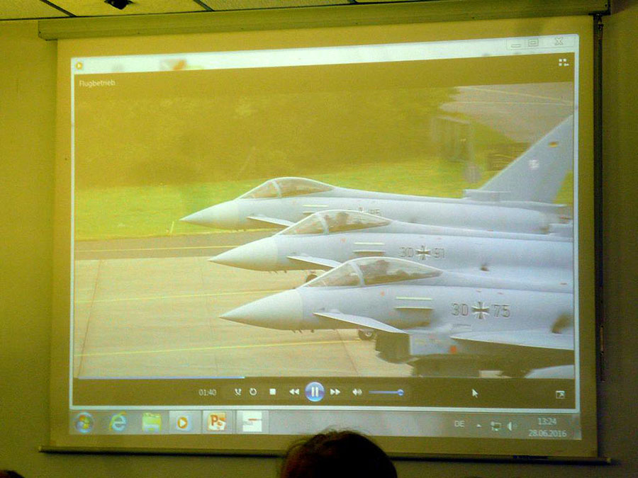 Nach dem Mittagessen in der Kantine erhielten die Besucher in einem anschaulichen Vortrag detaillierte Informationen über 60 Jahre Luftwaffe. Geschichte, Struktur und Auftrag der Luftwache, vor allem aber die Daten zu Starfighter, Tornado und Eurofighter fanden uneingeschränktes Interesse. Die dafür vorgesehene Stunde Zeit verging wie im Flug.
