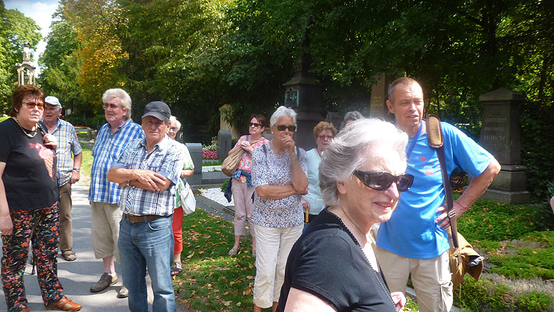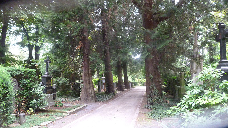 Höchst umweltfreundlich bewegten wir uns mit der Deutschen Bahn nach Köln. Tourleiterin Karin Olschewski hatte zunächst Köln-Deutz als Ziel ausgesucht. Im Brauhaus war reserviert und von hier konnten wir dann nach entsprechendem Genuss der vorzüglichen Brauhausküche gestärkt mit der Bahn Nr. 1 bis zur Universitätsstraße fahren. Nach einem kurzen Fußweg erreichten wir den Nebeneingang an der Piusstraße des Melaten-Friedhofs. Hier erwarteten uns zwei Tourführer, Ina und Günter, die uns kurzerhand in zwei Gruppen aufteilten.