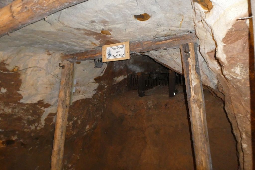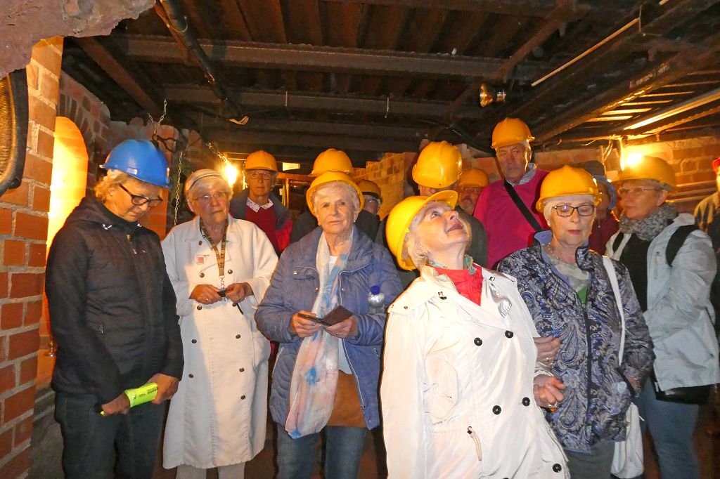 Zuerst aber konnte man das im Maßstab 1:100 nachgebaute Areal des Bleiabbaus sowie die Arbeitskleidung, beispielsweise sogenannte Karbidlampen (Gaslampen) und Arbeitswerkzeug der Bergleute, bestaunen. Dann aber ging’s „unter Tage“, mit bunten Schutzhelmen ausgestattet zum eigentlichen “Stollen”. „An der Hl. Barbara vorbei ging es in die Tiefe“, erinnert sich ein Teilnehmer.
