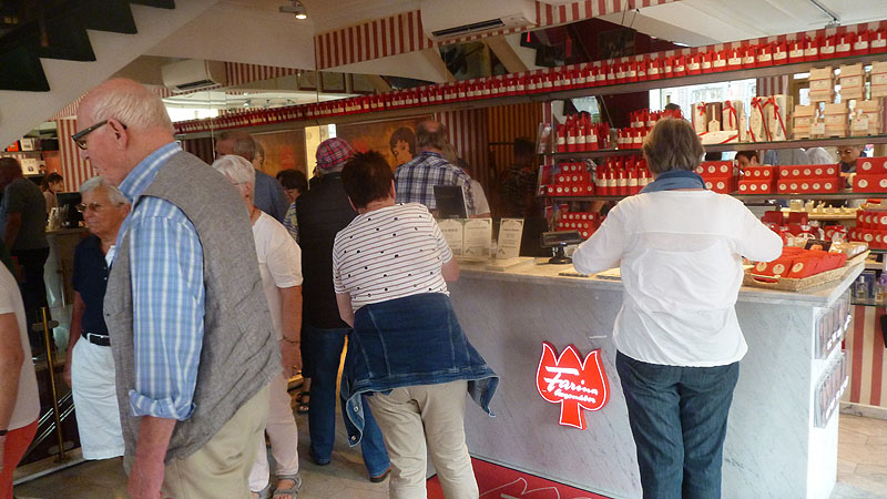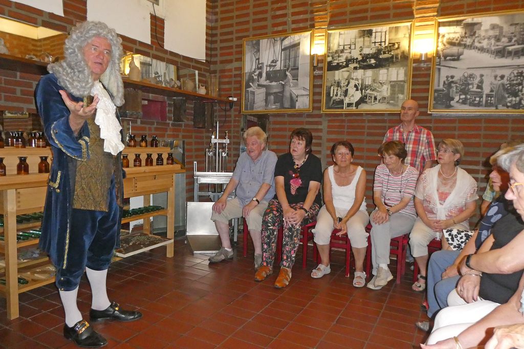 Zurück zum Stopp bei Farina: Jean Marie Farina (1685-1768) wurde beide Male, vollkommen überzeugend, nicht nur durch das Kostüm, sondern auch durch die extrem lebendigen und sehr informativen Führungen dargestellt. Im Laufe des Vortrages lernten die Senioren die Hintergründe zur Erfindung des „Eau de Cologne“ kennen; es wurde zudem auch in die Grundlagen eingeführt, die ein Parfumeur mit seinen Essenzen zur Herstellung eines Duftwassers (zur Überdeckung der damals üblichen Körpergerüche, weil Wasser nicht zum Waschen verwendet wurde) anwendet.