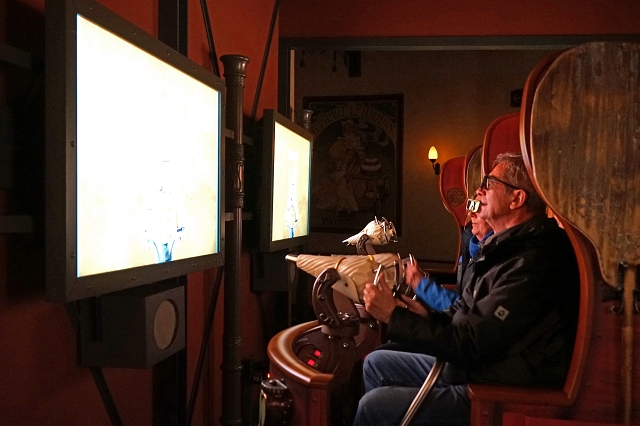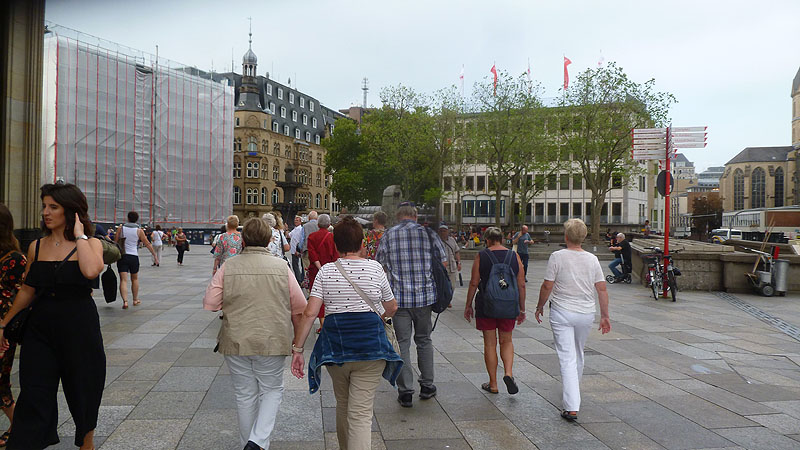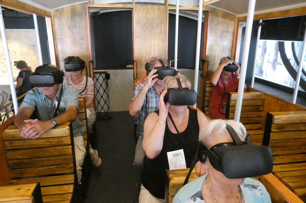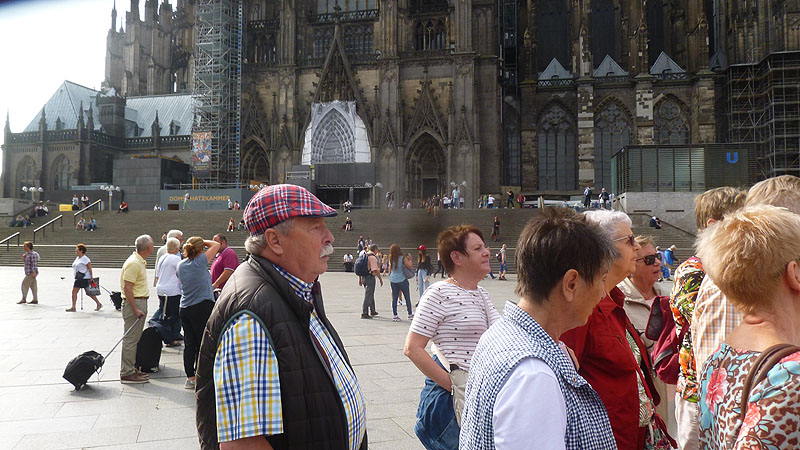 Im zweiten Teil des Urlaubtages ging’s zur Rückschau. Auch wenn einige wenige nicht mit den 3-D-Brillen für die virtuelle Zeitreise mit der Straßenbahn durch das Köln des Jahres 1908 gut zurecht kamen, war auch dieser Programmpunkt eine interessante Erfahrung und ein ausführlicher Rückblick in das Köln vergangener Tage. In der kurzen virtuellen Zeitreise waren auch kleine Szenen wie ein Diebstahl mit Verfolgung durch einen Polizisten als auch der Sturz eines Betrunkenen in den Rhein mit eingebaut. Den riesigen Zeppelin am Kölner Dom, der schon fertig und völlig ohne Gerüst da stand, wurde jedoch von allen bemerkt.