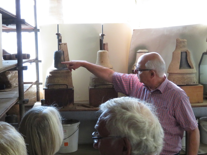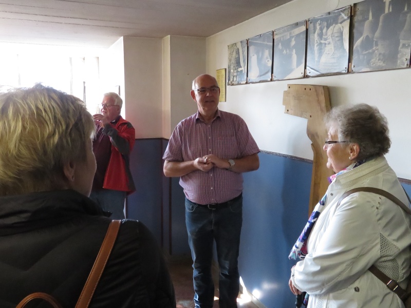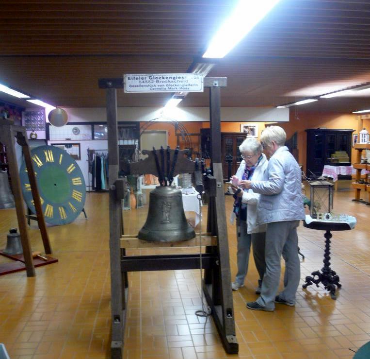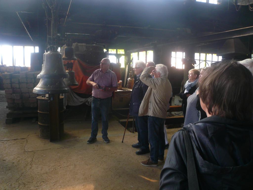 Tourleiter Volker Lohmeyer hatte als erstes Ziel und Station in Brockscheid die Glockengießerei ausgesucht. Die einstündige Führung wurde sehr anschaulich durch Lothar Schneider für die Älteren durchgeführt. Sie erfuhren, wie aufwändig der Herstellungsprozess einer Glocke ist und mit welch hohem handwerklichen Wissen und Geschick dies hier in einem der letzten fünf in Deutschland verbliebenen Glockengießereien geschieht. Das Wissen, um die für jede Glocke neu herzustellende Schablone wird in Brockscheid seit 1620 von Generation zu Generation weitergegeben. Aktuell wird der Betrieb, der pro Jahr zwischen 30 und 40 Glocken ausschließlich in Handarbeit herstellt, durch Cornelia Mark-Maas in sechster Generation geführt. Ein Teilnehmer dazu: „Wir waren schon einmal mit Führung hier und haben erst jetzt durch diesen Vortrag verstanden, wie eine Glocke hergestellt wird“.