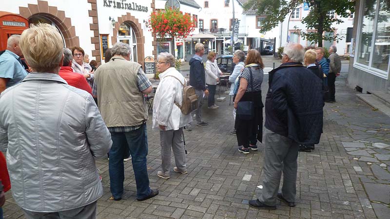 Danach stand ein kleiner Spaziergang an das „vor der Haustür“ gelegene Schalkenmehrener Maar an, dem sich schließlich ein Weg zur letzten Station „Hillesheim“ anschloss. Es folgte ein geführter Stadtspaziergang mit der ehrenamtlichen Stadtführerin Felicitas Schulz, lebendig und mit enormer Erzählfreude vorgetragen. Die Freude am gemeinsamen Stadtspaziergang war auf beiden Seiten so groß, dass die Stadtführerin Schulz sogar der BRH-Einladung folgte und mit ins „Cafe Sherlock“ zum Kuchenbuffet mit Kaffee, Kakao oder Tee folgte. Ein Teilnehmer: „Obwohl alles so lecker war und wirklich toll aussah, haben wir etwas Kuchen übrig lassen müssen. Es war einfach zu viel, zumal einige noch vom leckeren Mittagessen satt schienen.