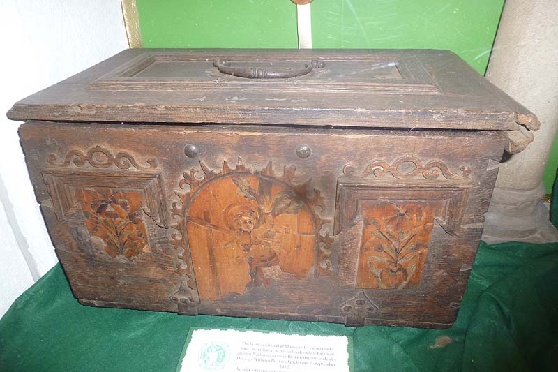 „Der Feldherr Tilly hatte die Ratsherren zum Tode verurteilt und wollte die Stadt brandschatzen lassen. In ihrer Not boten ihm die Ratsherren als Willkommenstrunk Wein in einem prachtvollen bunten Glasbecher dar, der 3 1/4 Liter fasste. Tilly wurde dadurch milde gestimmt und sagte, wenn jemand diesen Becher voll Wein in einem Zuge austrinken könne, würde er die Stadt verschonen. Altbürgermeister Georg Nusch (1588–1668) meldete sich freiwillig und zu jedermanns Erstaunen gelang es ihm, den Becher in einem Zug zu leeren. Tilly war davon so beeindruckt, dass er die Stadt verschonte.“ Quelle: Wikipedia