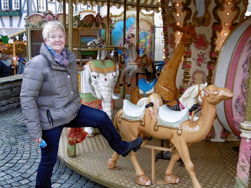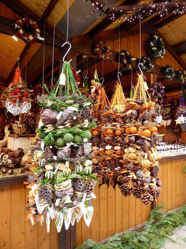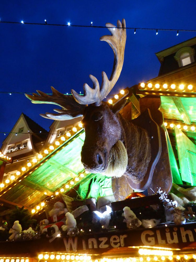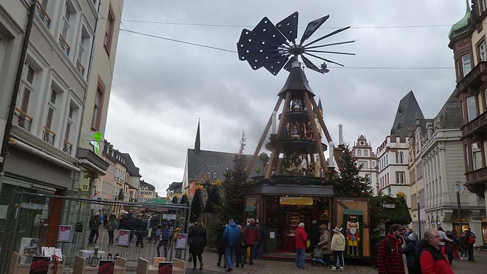 Welch Wunder! In Trier angekommen war das Wetter - sieht man mal von einer kurzen Schauer ab - dann doch ganz gut. Die Senioren empfingen wunderbar geschmückte Buden, die nicht nur zum Schauen einluden. Selbst die Dächer waren mit ganz vielen Weihnachtsmotiven, Rentieren, Rehen und Engeln geschmückt. An einer meterhohen Pyramide drehten sich beleuchtete Flügel.