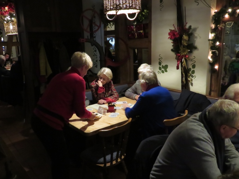 Weiter ging es dann nach Rothenburg. Nach dem Einchecken im Hotel blieb noch genug Zeit, ins Städtchen zu gehen und erste Eindrücke zu sammeln. Am Weihnachtsmarkt kam man natürlich nicht vorbei. Abends gab es im "Rappensaal" ein Adventsbuffet, das wirklich keine Wünsche offen ließ. Der Auftritt des "Kellermeisters", der uns den "Meistertrunk" zu Gehör brachte, war ein Höhepunkt des Abends. Jeder, der mochte, konnte aus dem 13 Schoppen umfassenden Meistertrunkhumpen ein "Schlückchen" genießen.