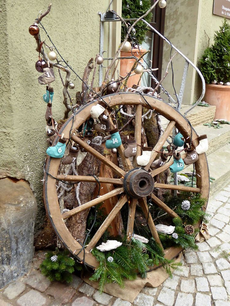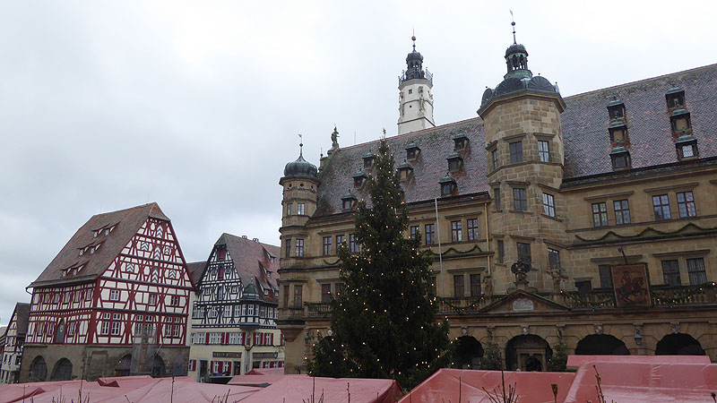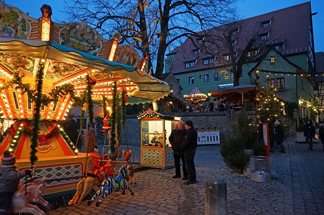 Noch am Nachmittag treffen wir am Hotel "Rappen" in Rothenburg ob der Tauber ein. Es reicht gerade noch für einen Ersteindruck der weihnachtlichen Stimmung in der Stadt, bevor ein "Adventbuffet" vom historisch gekleideten Kellermeister mit dem "Meistertrunk" eingeleitet wird, dem kulinarischen Tagesabschluss im - leider akustisch ungedämpften - "Rappensaal". Das Innere der von einer mittelalterlichen Stadtmauer noch fast gänzlich umrahmten Stadt lernen wir in einer ausführlichen geführten Stadtbegehung kennen. Diese endet am Weihnachtsmarkt mit ausreichenden Verpflegungsständen und - teils versteckten - Kunsthandwerk-Angeboten.