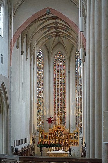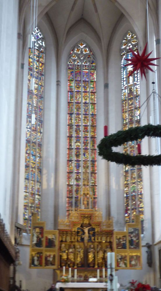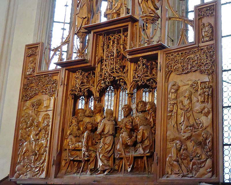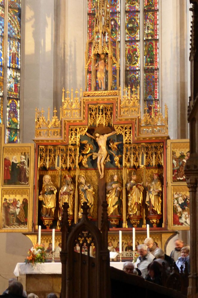 Die St. Jacobs-Kirche entstand zwischen 1311 und 1322. Besonders erwähnenswert ist der Hauptaltar mit herausragenden Schnitzereien und der bemalten Rückseite. Oben links ist der Marktplatz von Rothenburg um 1466 dargestellt.