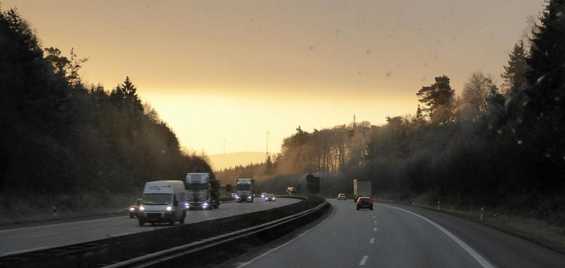 Morgens früh um Sechs fahren wir nach Euskirchen zum Treffpunkt. 5 Grad bei pünktlicher Abfahrt Richtung Süden, null Grad um 08:34 Uhr, eine Stunde später zeigt sich die aufsteigende Sonne.