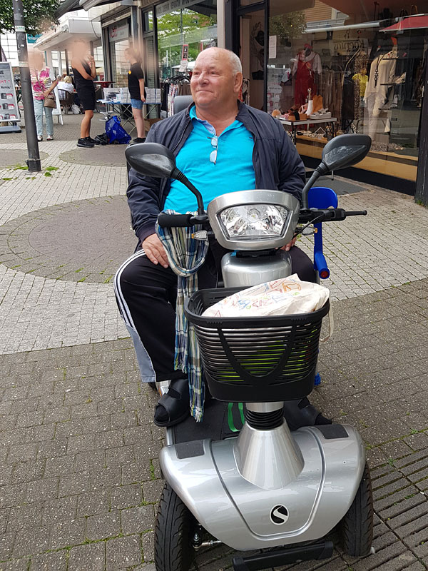(Euskirchen) „Ohne dieses Gefährt käme ich aus der Wohnung nicht mehr nach draußen, stets müsste einer zur Stelle sein, der mich mit einem Rollstuhl schiebt!“ Eine klare Meinung hat BRH-Mitglied Klaus Reimer zur Frage der Beweglichkeit mit seinem neuen Senioren-Mobil. Der Mann vom Seniorenverband BRH findet die Nutzungsmöglichkeit einfach ideal für seine alltäglichen Fahrten im Stadtbereich oder sogar bei gelegentlichen Trips in die Natur. Er kann nun beachtliche Entfernungen zurücklegen, nach Lust und Laune losbrausen, auf Straßen, Radwegen und Bürgersteigen, sogar querfeldein...und wo kein Fußweg in Sicht ist, darf er auch den Radweg oder die Straße benutzen. Was für ein Traum für einen Gehbeeinträchtigen, den sich sicherlich immer mehr Senioren auch erfüllen möchten.