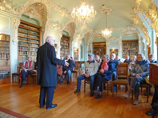 Tourleiterin Karin Olschewski hatte für fast hundert Senioren ein erlebenswertes Tagesprogramm zusammengestellt, das Mitstreiterin Birgit Lorbach, zuständig für den zweiten Bus, im Zeitraffer so darstellt: Auf ging’s zur Abtei Rolduc am Rande von Kerkrade. Uns erwartete eine großzügig angelegte Klosteranlage, deren Anfang auf das Jahr 1104 zurückgeht und mit einer einfachen Unterkunft und einer Holzkapelle begann. Heute gehört Rolduc zu den wichtigsten religiösen Denkmälern in Limburg. Aufgrund der Teilnehmeranzahl wurden drei Gruppen gebildet, die sehr kompetent und ausführlich über die Geschichte der Abtei Rolduc informiert wurden. Besichtigt wurden u.a. die Rokoko-Bibliothek, der Bischofssaal und die wunderschön ausgemalte Kirche mit der Krypta. Danach waren die Teilnehmer zu Kaffee und Kuchen eingeladen, es durfte sogar „geschlemmt“ werden.
